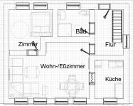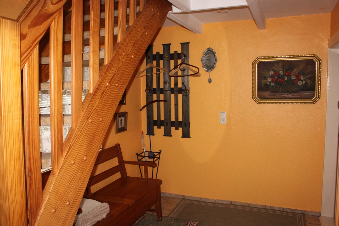 Im Eingangsbereich ist eine Treppe, die in das Obergeschoß führt. Dort befindet sich das Schlafzimmer. |