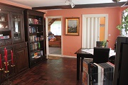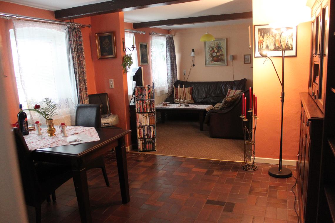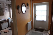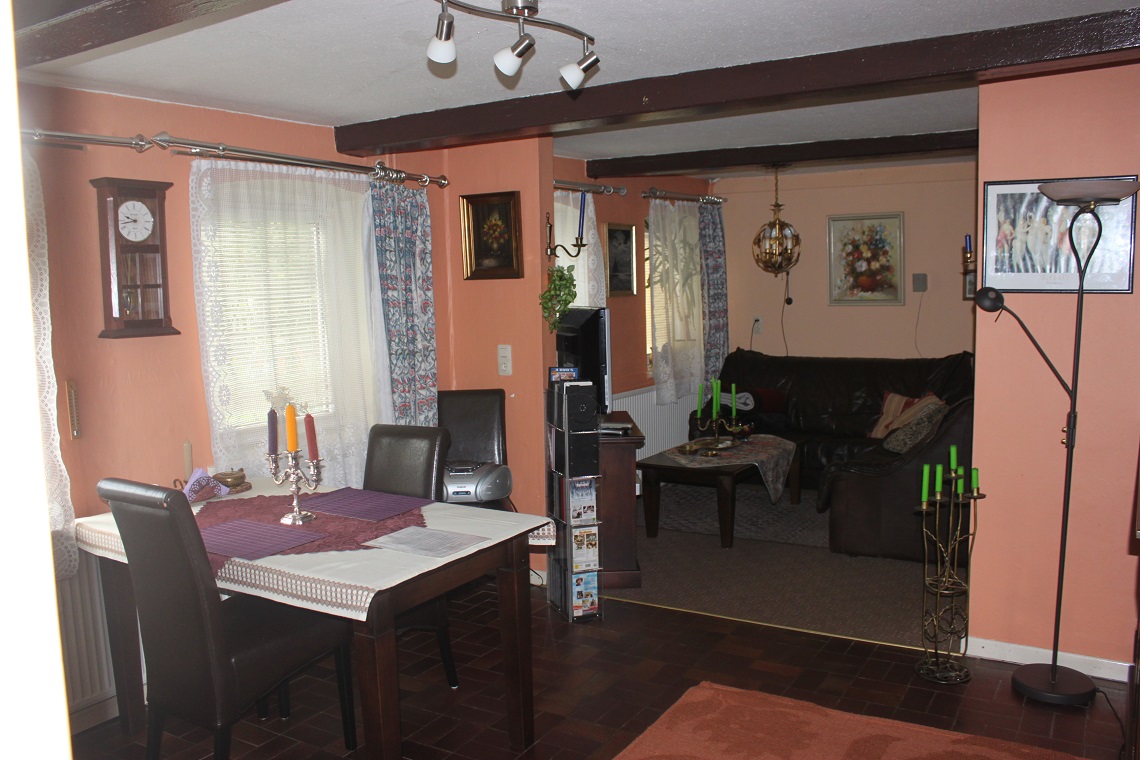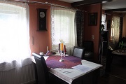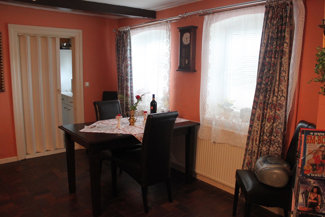 Das Eßzimmer ist gleich neben der Küche. Ein Eßtisch mit Stühlen steht am Fenster, mit Blick in den Garten, in dem man auch sitzen und frühstücken kann. Für zusätzliche Unterhaltung sorgen Fernseher, DVD-Player und eine Musikanlage. |